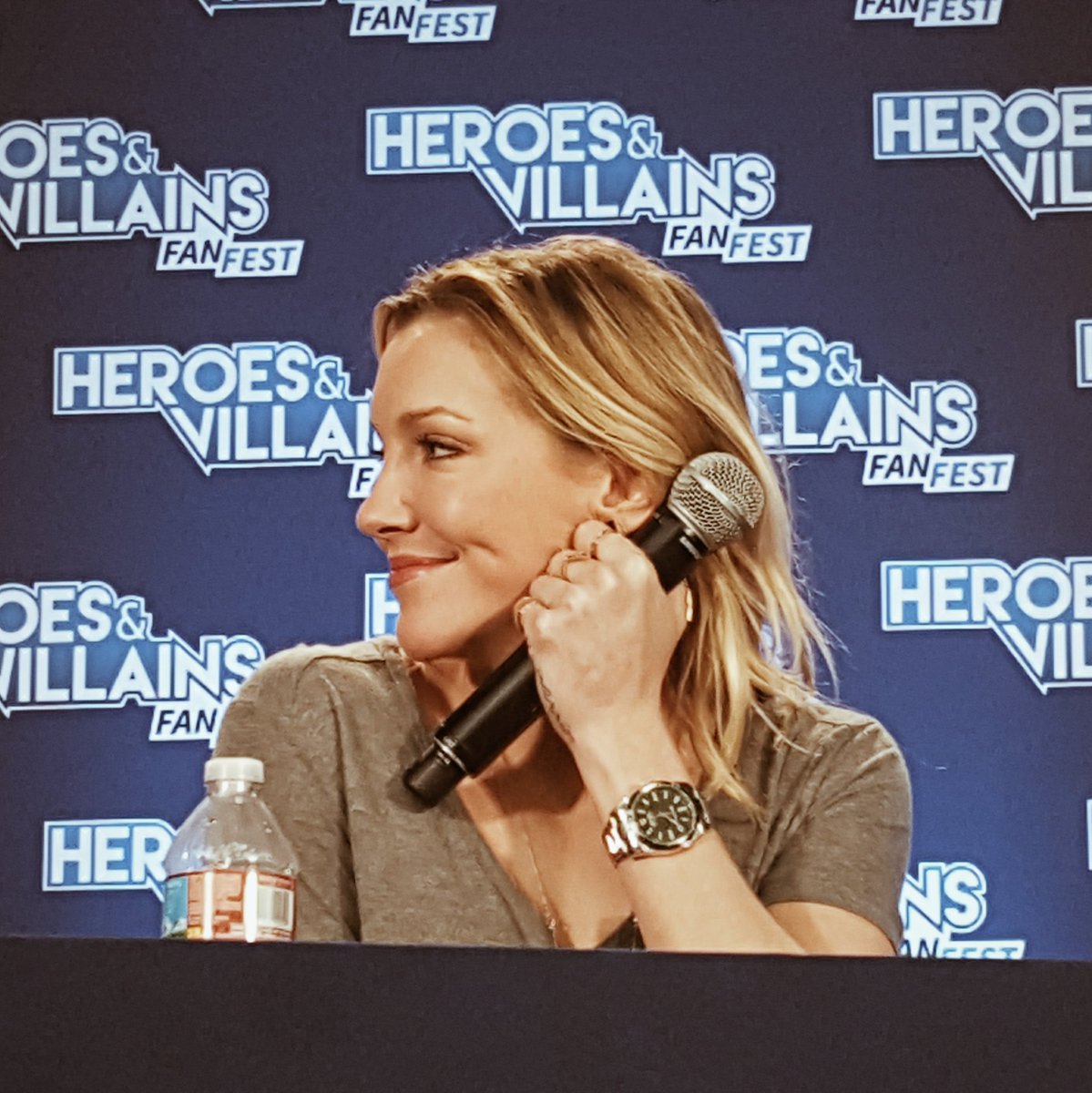También contó una anécdota sobre cómo apretaba Stephen en culo en una escena… Fue durante una escena del crossover: Stephen y Grant estaban delante, Hawkgirl y Hawkman a un lado, Emily… David y Willa estaban detrás de Stephen y Grant y se dieron cuenta de que Stephen tiene una especie de tic en el culo: